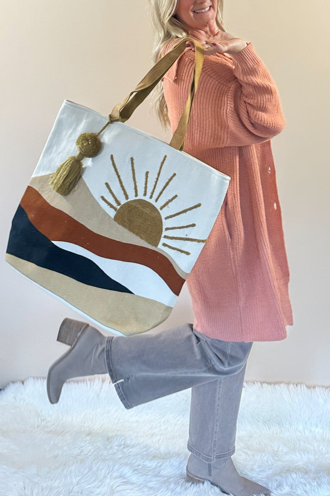 This multicolored sunrise tote brings all the warm, desert-inspired vibes with its bold woven design and textured sun detail. Finished with a mustard pom tassel for that extra playful touch, it’s the kind of piece that turns even your simplest outfit into something fun.