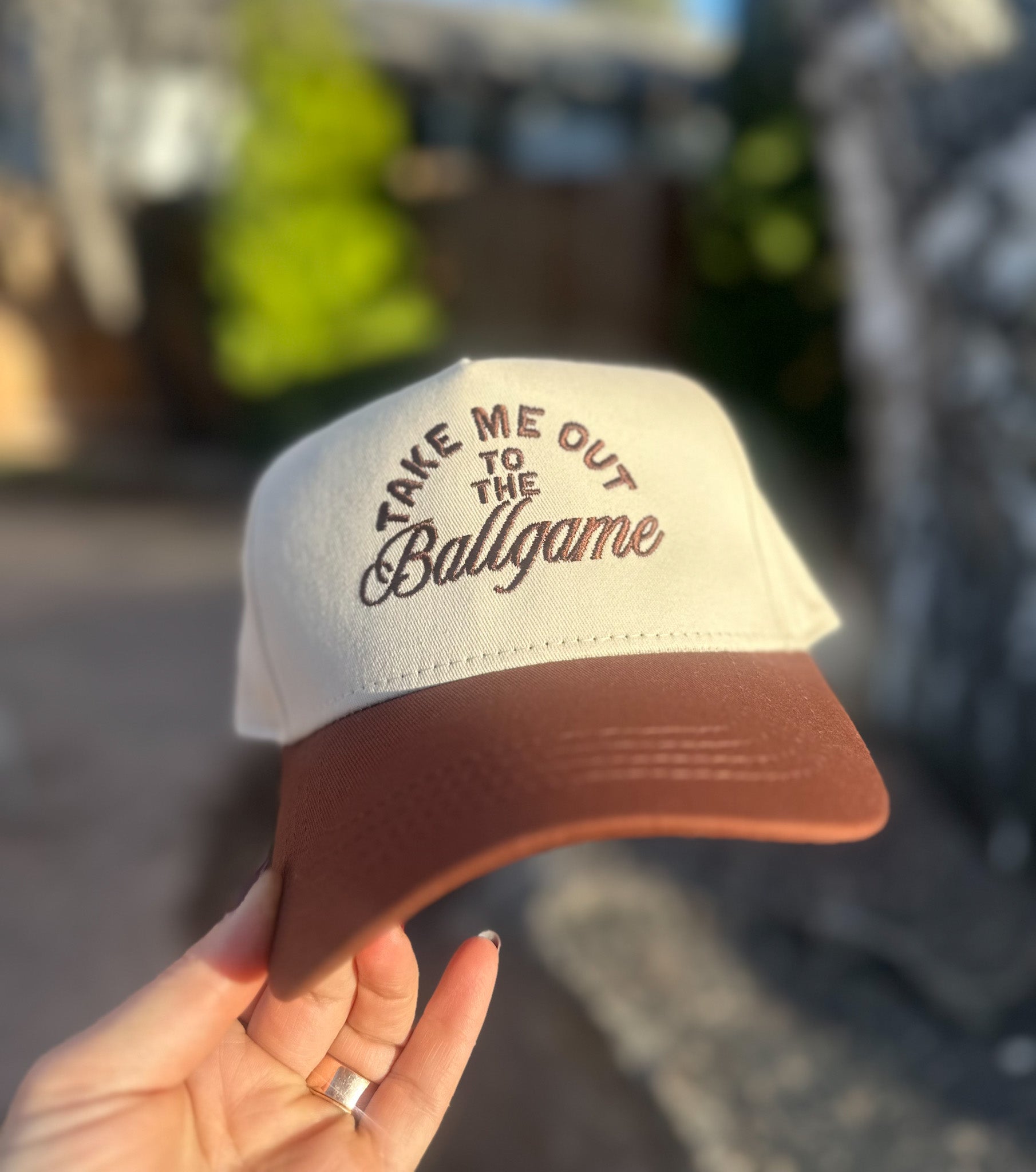Meet your new go-to hat for game days, patio nights, and everything in between. The Take Me Out To The Ballgame features a classic cream crown with a brown bill and embroidered “Take Me Out to the Ballgame” lettering for that perfectly nostalgic, all-American vibe.