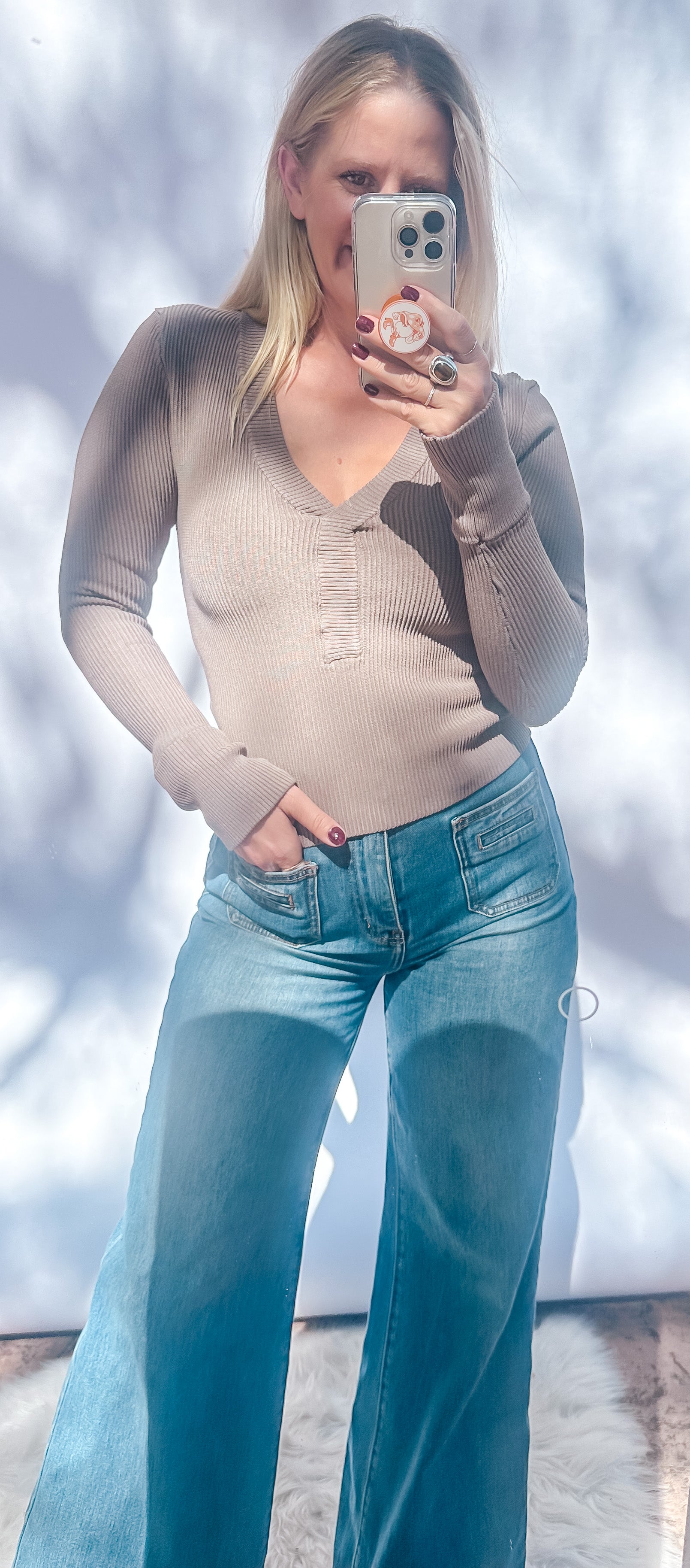 Sleek, sculpted, and sophisticated — this top does it all. Made from our premium stretch shaper fit fabric, this ribbed knit long sleeve is designed to smooth, contour, and sculpt your body while offering all-day comfort. The deep V neckline adds just the right amount of edge, making it a versatile piece that transitions seamlessly from day to night.